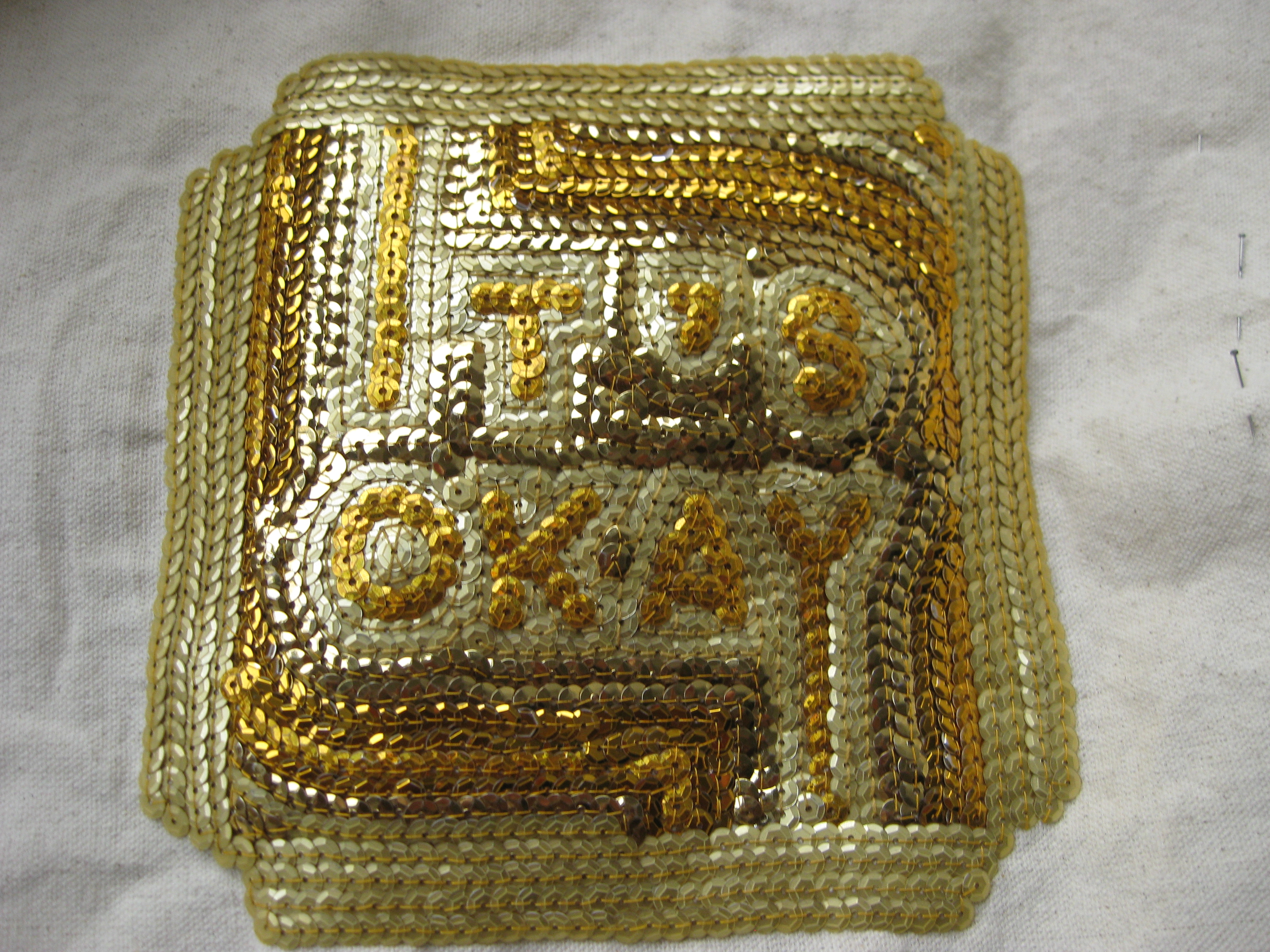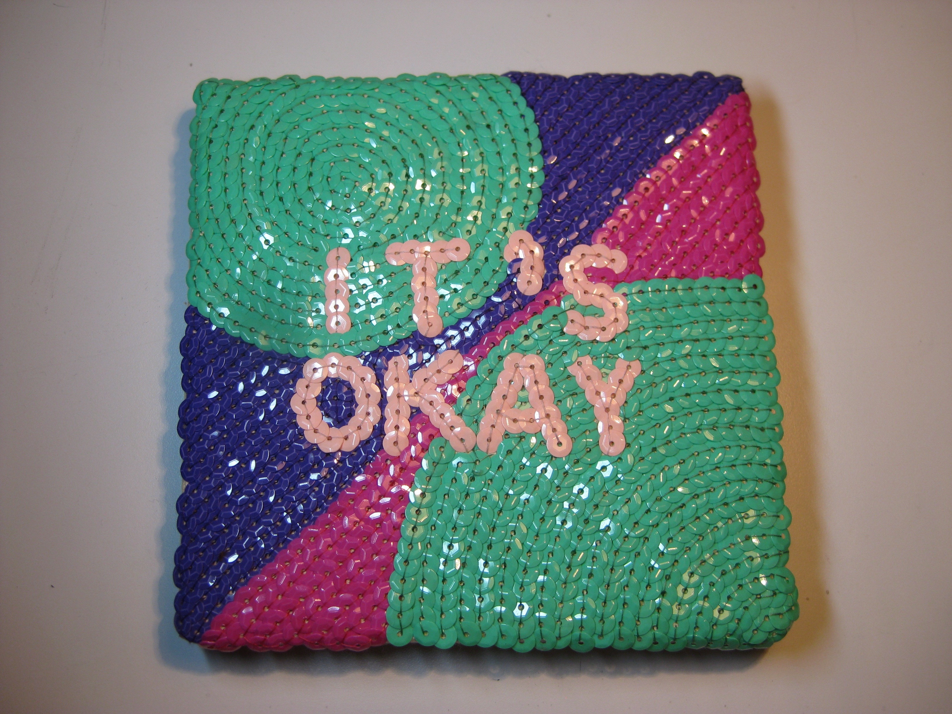 These works are part of an ongoing project of embroidered sequins versions of daily affirmations creating firm and strong amour-like objects. The process of sewing the sequins individually by hand is arduous and time consuming and it is hard not to meditate on the phrase or word that you are spending days completing, thus turning it into a sort of mantra. The overall experiment that I am attempting with this project is to turn the actual physical art project into merely a bi-product and redressing the art process as the project. I am the art project. You are the art project.