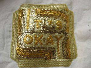 This year the theme for the show is The Wall. The way I interpreted the call was to work on some emotional walls that trip me up and get in the way of my constantly struggling self-esteem. I find that I am my worst enemy most, if not, ALL of the time. In the case of this art piece I have embroidered the simple statement “It’s okay”. It is a reassurance, a consolation, a soothing gesture giving myself permission to screw up and be lousy and be less than perfect because you know what? It’s okay!