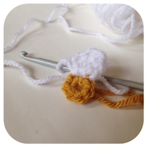 2) Change colours, (sc, dc, 3 tc, dc, sc) in each stitch to form 8 petals.