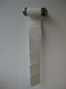 4″ x 3″. Cascades. 2009. Using hand beaded replicas of existing toilet paper patterns as a watermark, I press individual sheets of toilet paper and sew them together to form rolls.