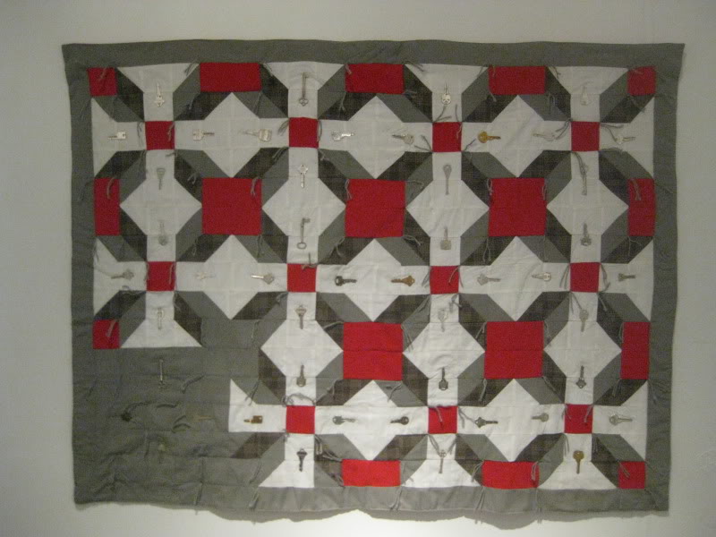 53″ x 65″ Quilt from The Past is Not a Place installation 2010. Cotton quilt with metal keys and braille using glass beads.